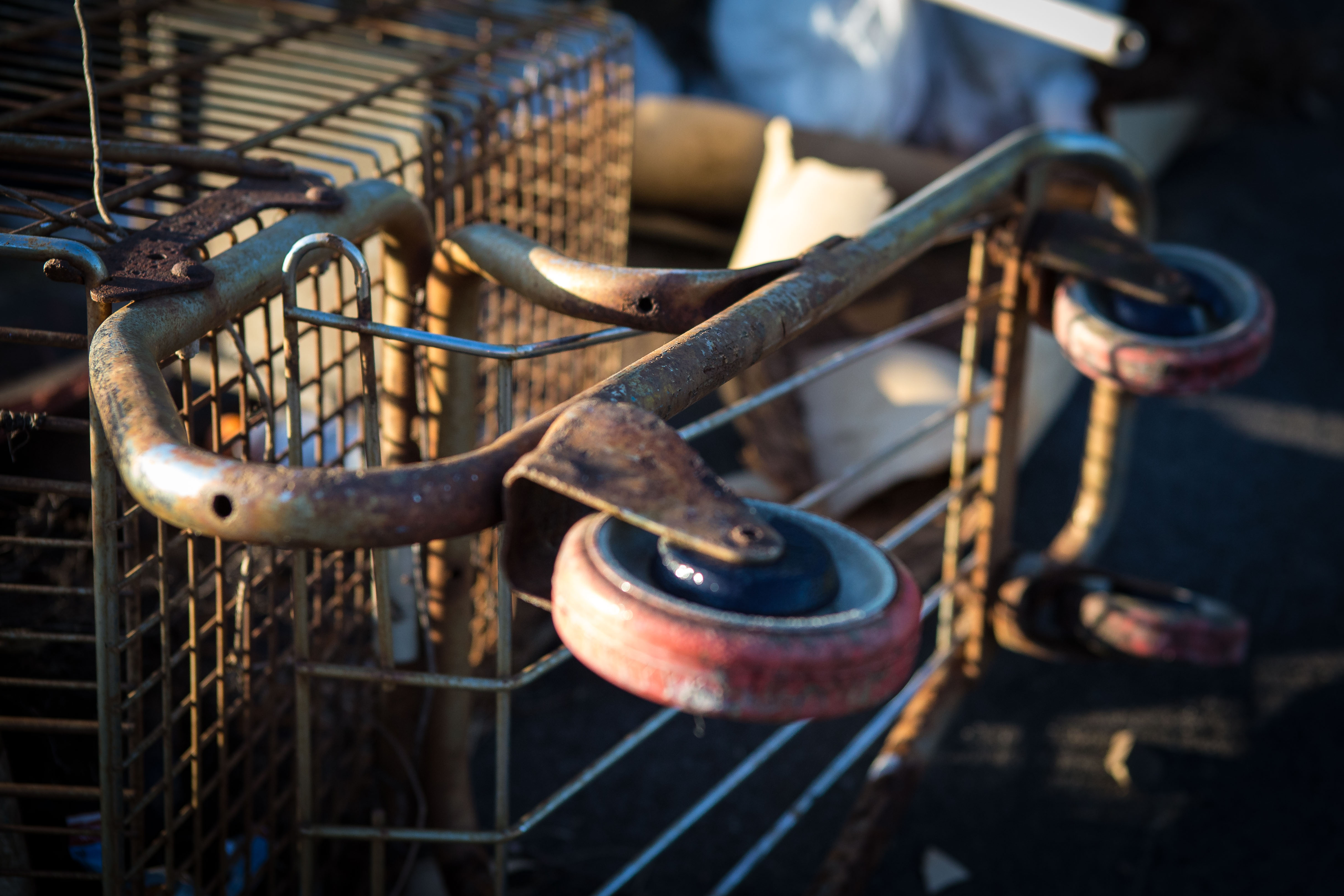 A wooden pallet, discarded planks, a tire, a metal folding chair…