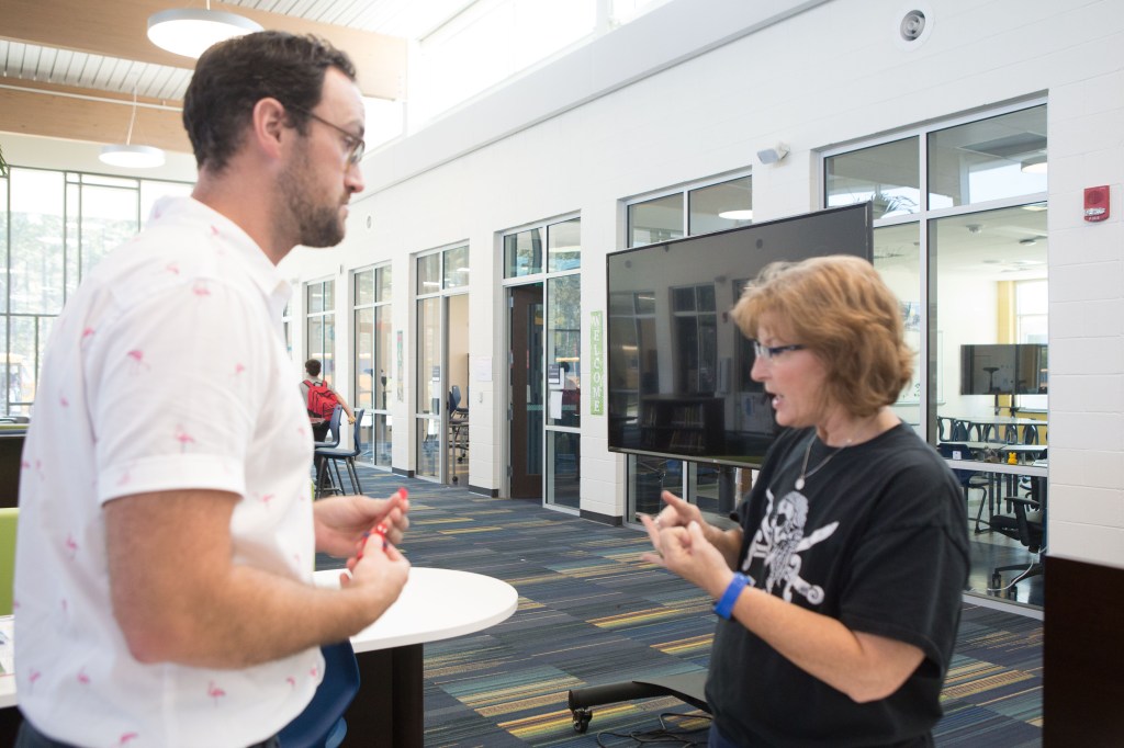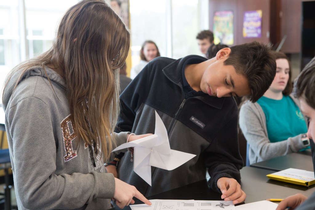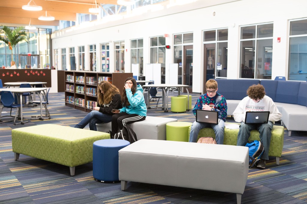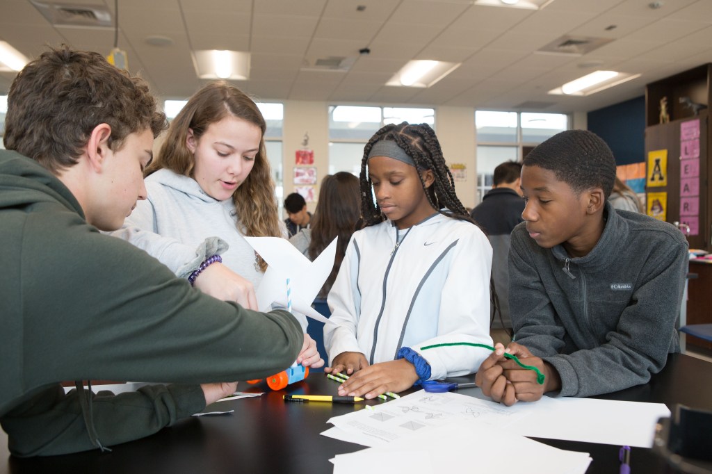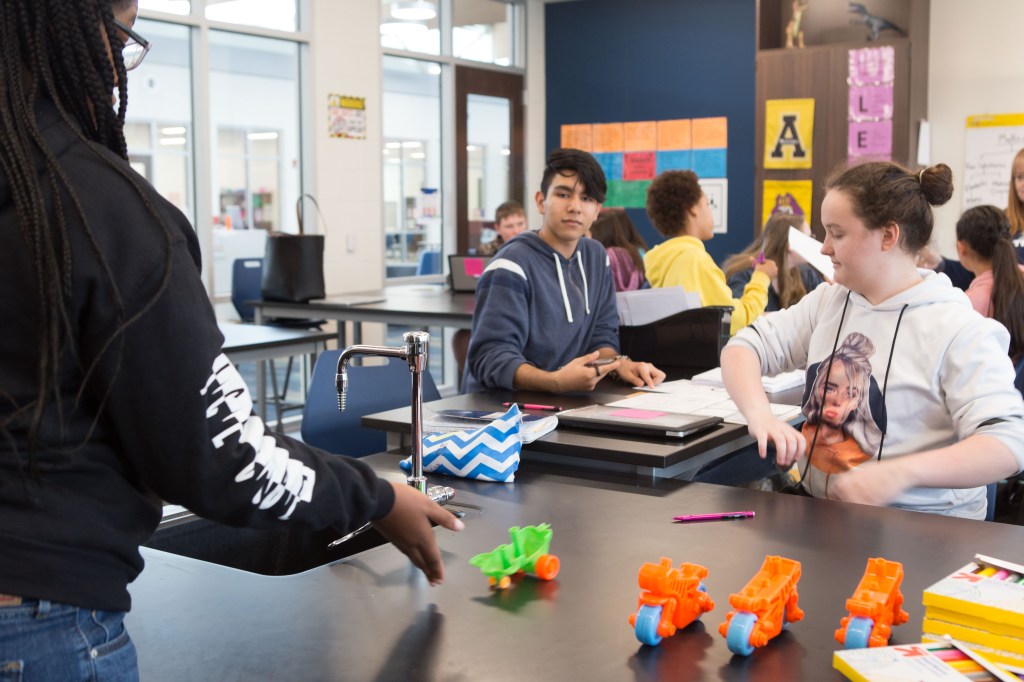 For some teachers, the flexible learning environment influences more collaborative instructional approaches; for others, it beautifully accommodates existing practice. Never has a visit to Tammy Wicks’ class, in the old or new building, resulted in a dry, throat-scratching scientific lecture. No! Students are always actively engaged in a variety of fun and rigorous tasks that require them to put their hands on the learning and rely on each other to solve problems. Breaking out of escape rooms and designing wind-powered cars, students use the copious black slab tables in her large science lab to prep for the race–apologies–for the experiment! Limited to materials provided and each other, Wicks’ students engaged in the kind of collaborative tasks that strengthen learning communities, foster independent competence, and deepen conceptual understandings about content.