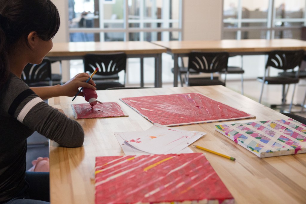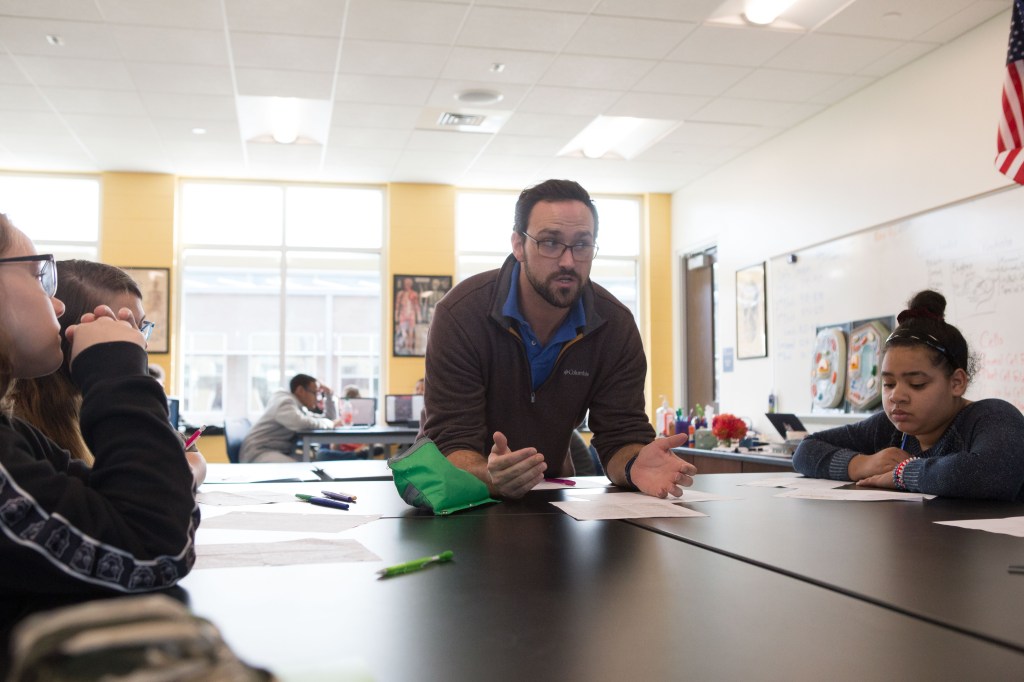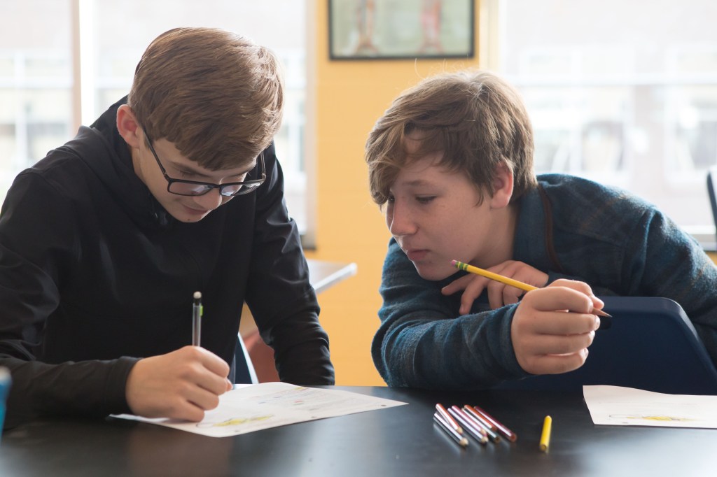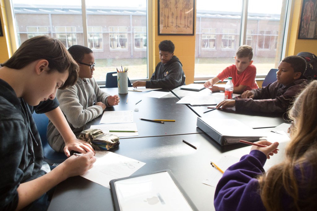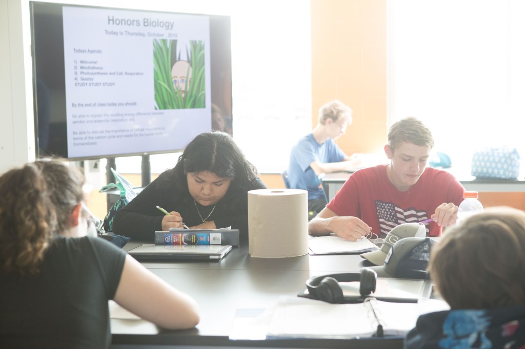 For some teachers, the flexible learning environment influences more collaborative instructional approaches; for others, it beautifully accommodates existing practice. Never has a visit to Tammy Wicks’ class, in the old or new building, resulted in a dry, throat-scratching scientific lecture. No! Students are always actively engaged in a variety of fun and rigorous tasks that require them to put their hands on the learning and rely on each other to solve problems. Breaking out of escape rooms and designing wind-powered cars, students use the copious black slab tables in her large science lab to prep for the race–apologies–for the experiment! Limited to materials provided and each other, Wicks’ students engaged in the kind of collaborative tasks that strengthen learning communities, foster independent competence, and deepen conceptual understandings about content.