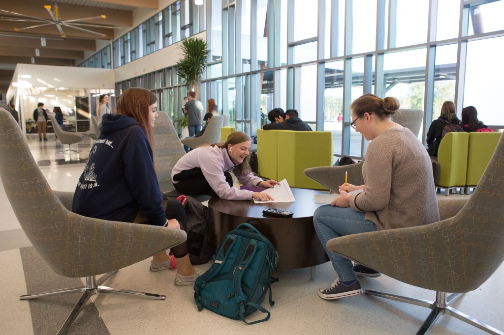 Anna Fair and other juniors, pictured below, who indicated they need more time to use common areas for project-based learning, are seated just outside of their social studies classroom, prepping for an upcoming assessment. When asked how they feel about their new school, the students lament the loss of their old one, disparage the glass walls, and believe the new swanky building has brought on too many changes (e.g., new principals, new rules). Students believe new social sanctions restricting use of main common areas are creating more isolation than community among the student body. In actuality, at the writing of this review, JSHS students are not permitted to gather informally in the main common areas during lunch because of their own undoing. Irresponsible use of the space such as leaving plates of food behind, spilling drinks, and other lackadaisical acts of adolescent dereliction led to loss of the privilege. Equally, administration seeks to protect protect the learning environment of the other classes (e.g., (Business, Entrepreneurship, Nursing / Health Sciences, Foods) being held right along the corridor of front lobby collaborative space.