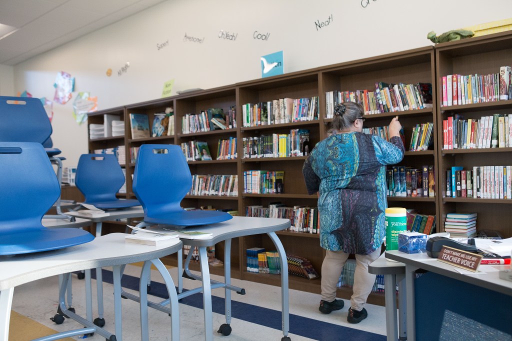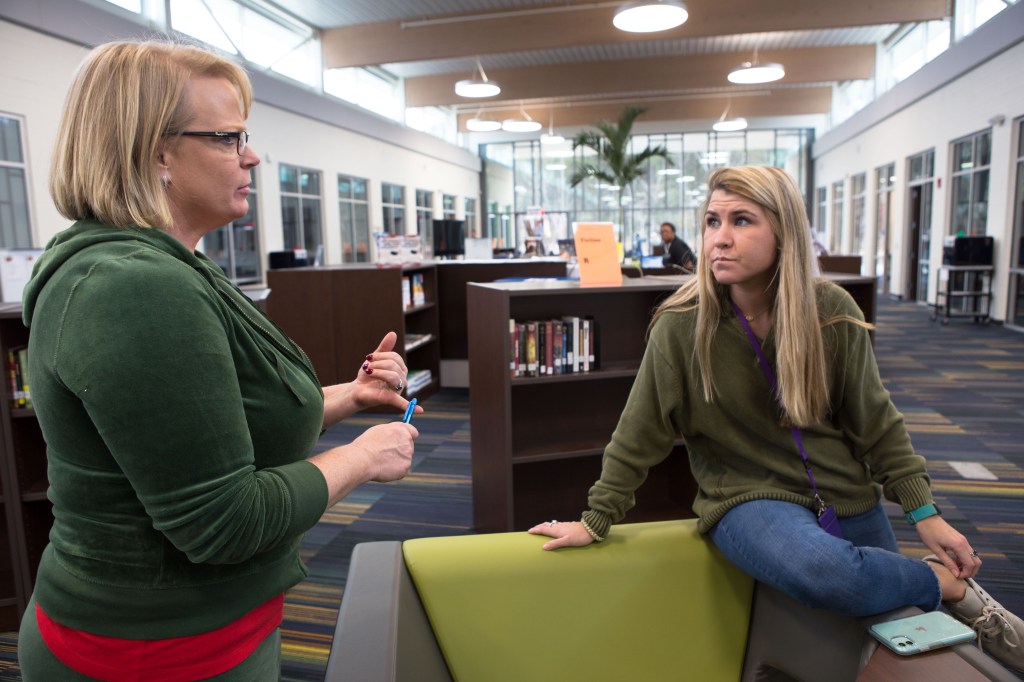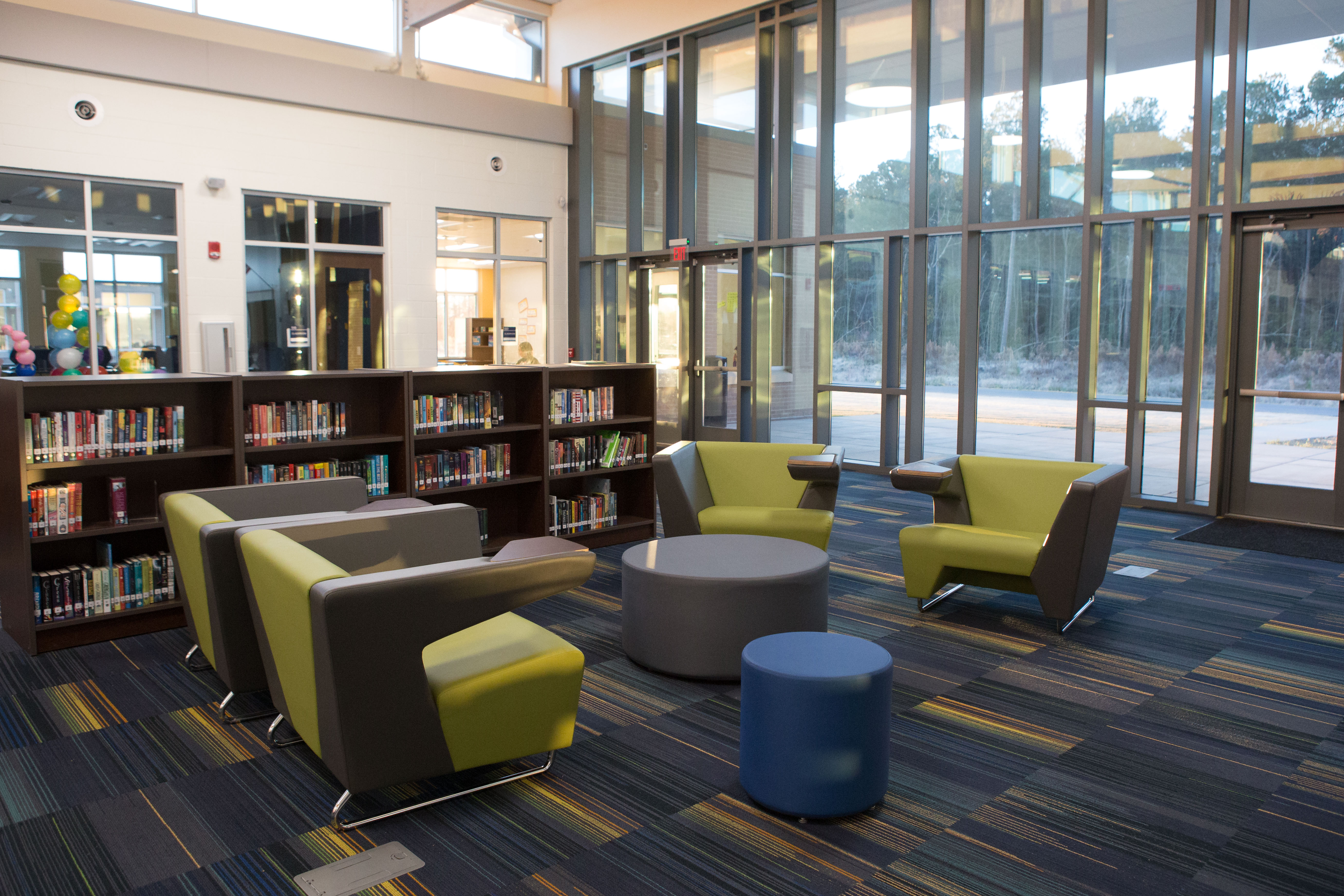 Grimmett is not speaking figuratively when she indicates the school is designed purposely to extend learning beyond the four walls of the classroom. Literally, classrooms only have two full concrete walls. The other “walls” are glass. You can see the media center, its resources, and the rest of the school’s living, breathing, and moving world right outside any classroom window.