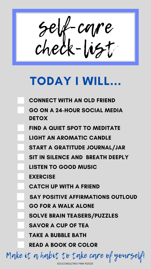 Fear and anxiety can be overwhelming and cause strong emotions in adults and children. Learning how to cope with stress will make you, the people you care about, and your community stronger. Research tells us that children and adults benefit greatly from consistent and deliberate self-care activities. Learning how to take care of ourselves regularly will help ensure that we have the skills to manage future stressors in healthy and effective ways. Doing self-care activities not only helps cultivate good habits, it also helps the mind and body operate at their best. Making self-care a priority equips us physically, mentally, emotionally, and spiritually to care more authentically and enthusiastically for others. So, let us know how you are feeling by going to our AnswerGarden page, and check out our self-care checklists below.